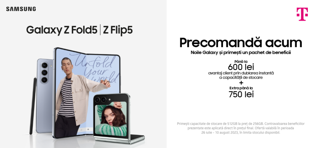 Clienții interesați pot plasa o precomandă până pe 10 august 2023, pe https://mobile.telekom.ro/precomanda-samsung-z/.