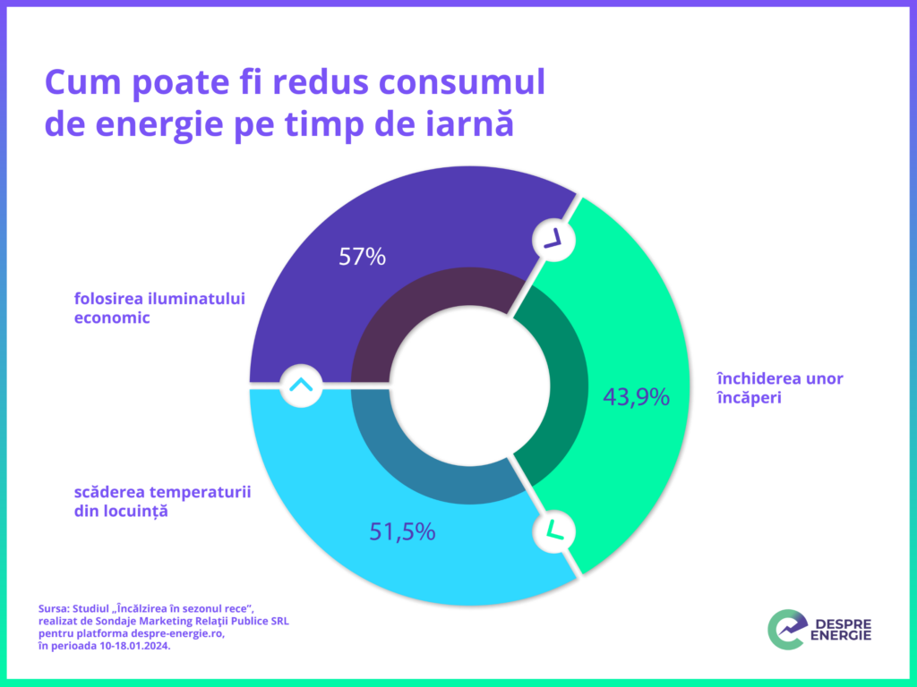 De altfel, această nevoie de control a costurilor a fost evidențiată distinct de circa 45% dintre respondenți, care au răspuns afirmativ atunci când au fost întrebați dacă au luat o măsură de economisire a energiei pe timpul iernii. În schimb, 42% au afirmat că nu au adoptat nicio măsură de reducere a consumului de energie, dar se gândesc la opțiunile posibile. Între acestea, cel mai des indicate de respondenți se numără folosirea iluminatului economic (57%), scăderea temperaturii din locuință (51,5%) și închiderea unor încăperi (43,9%).