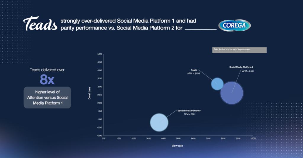- Teads delivered 8x more attention compared to the Social Media Platform 1 and parity performance vs. the Social Media Platform 2. Moreover, Teads over-performed the Platform 2 on Dwell time and generated over 2x higher view rate vs. the Platform 1.