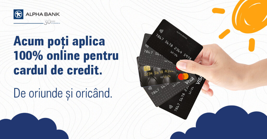 The credit cards (purchases) that can be obtained on 100% online flow are: AlphaCard Visa Credit, Alpha Mastercard Credit, AlphaCard Visa Gold RON, AlphaCard Visa Gold EUR and Mobexpert Credit Card. Also, until 30 September 2024, for AlphaCard Visa Credit, Alpha Mastercard Credit and Mobexpert Credit Card, customers benefit from zero issuing and administration fees for the first year and all cards are delivered to their home by courier with zero delivery fee.