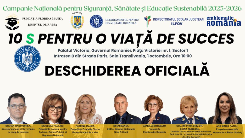 După succesul primei ediții desfășurate în iunie la Senatul României, Conferința Națională „10 S pentru o Viață de Succes” revine miercuri, 1 octombrie 2025, ora 10:00, la Palatul Victoria – Sala Transilvania. Evenimentul face parte din Campania Națională pentru Siguranță, Sănătate și Educație Sustenabilă 2025-2026 și aduce în prim-plan teme esențiale pentru viitorul României.