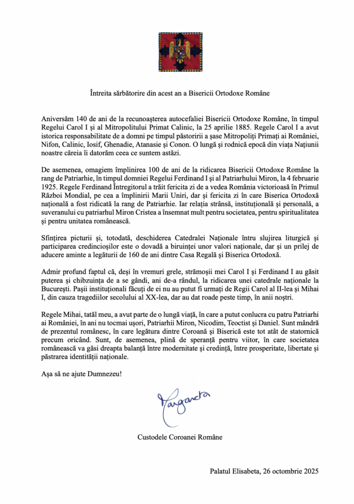 Regele Mihai, tatăl meu, a avut parte de o lungă viață, în care a putut conlucra cu patru Patriarhi ai României, în ani nu tocmai ușori, Patriarhii Miron, Nicodim, Teoctist și Daniel. Sunt mândră de prezentul românesc, în care legătura dintre Coroană și Biserică este tot atât de statornică precum oricând. Sunt, de asemenea, plină de speranță pentru viitor, în care societatea românească va găsi dreapta balanță între modernitate și credință, între prosperitate, libertate și păstrarea identității naționale