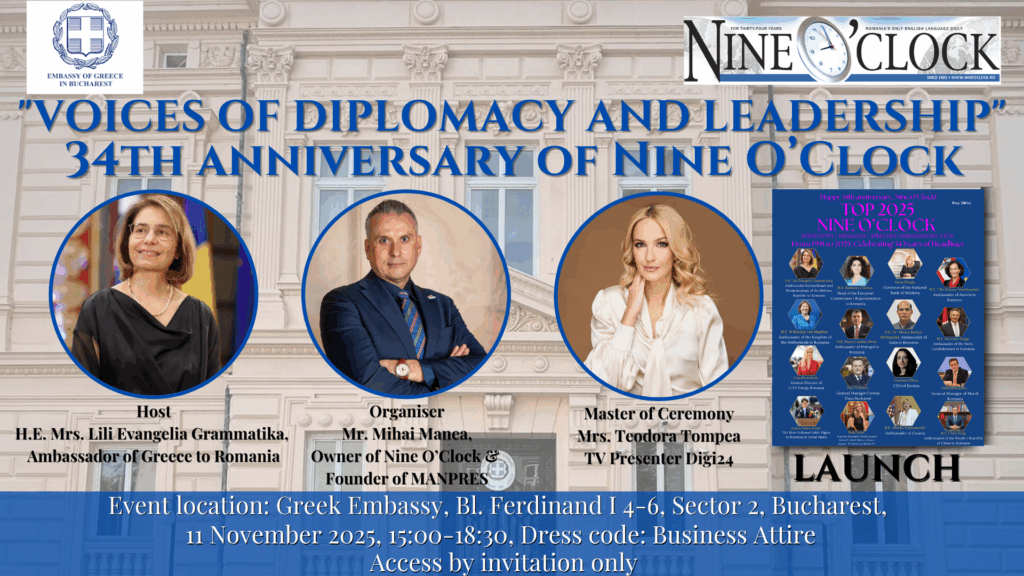 Nine O’Clock, primul ziar în limbă engleză din România, aniversează 34 de ani de excelență în jurnalism și dialog internațional prin organizarea evenimentului de înalt nivel „Vocile Diplomației și ale Leadershipului” și lansarea volumului „Top Interviews, Messages & Speeches from Ambassadors and CEOs – Ediția a II-a, 2025”. Evenimentul este organizat în parteneriat cu Instituția Diplomatică a Republicii Elene la București.
