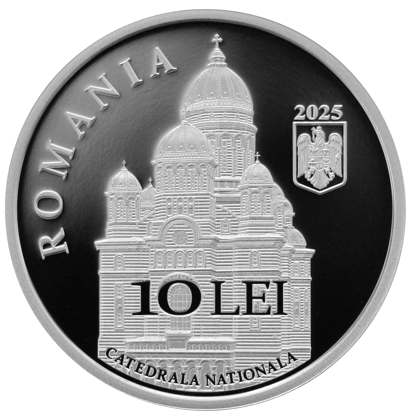 Aversul monedei din argint prezintă macheta Catedralei Naționale, inscripțiile „ROMANIA” și „CATEDRALA NATIONALA” în arc de cerc, anul de emisiune „2025”, stema României și valoarea nominală „10 LEI”.