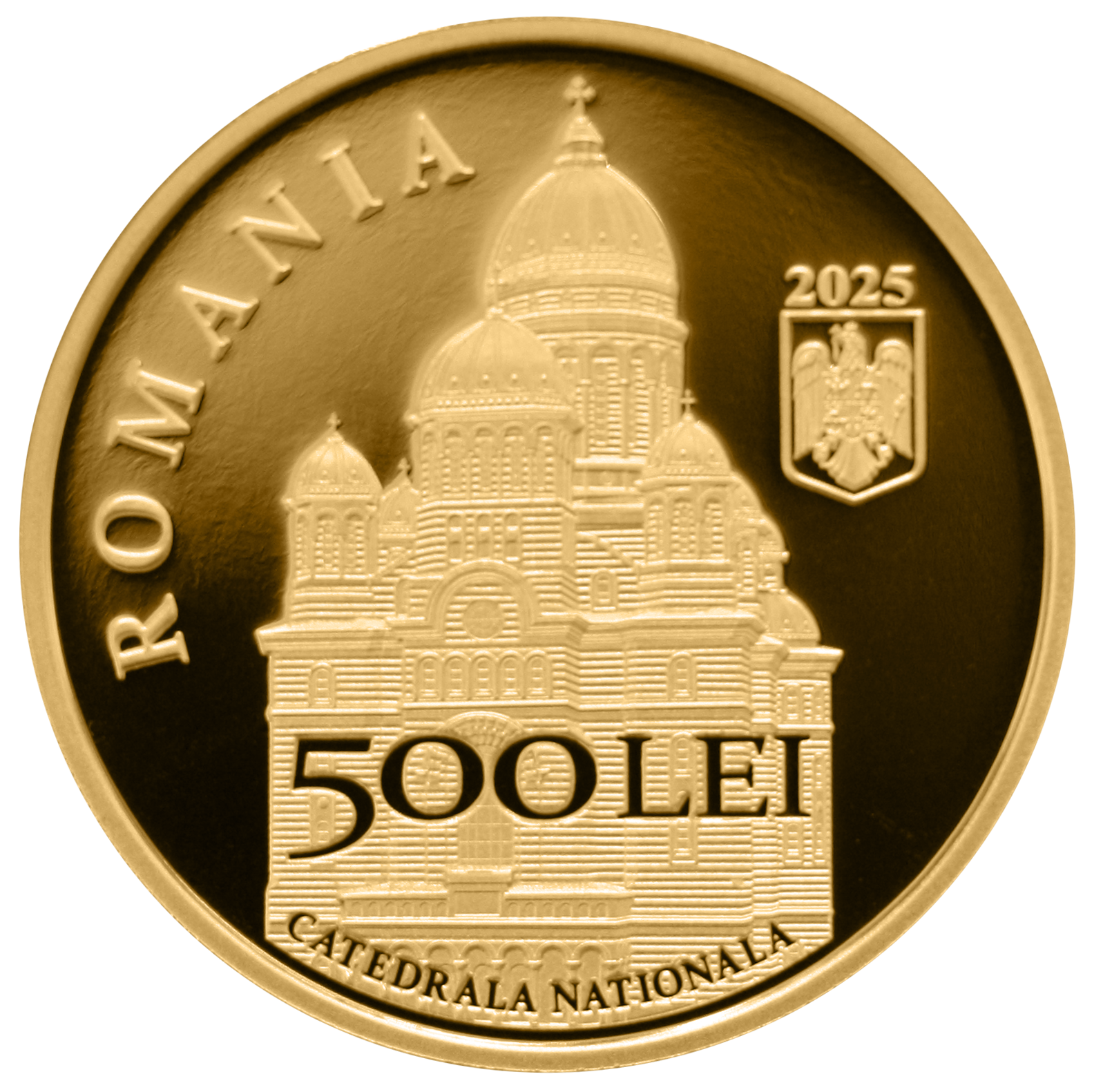 Aversul monedei din aur prezintă macheta Catedralei Naționale, inscripțiile „ROMANIA” și „CATEDRALA NATIONALA” în arc de cerc, anul de emisiune „2025”, stema României și valoarea nominală „500 LEI”.