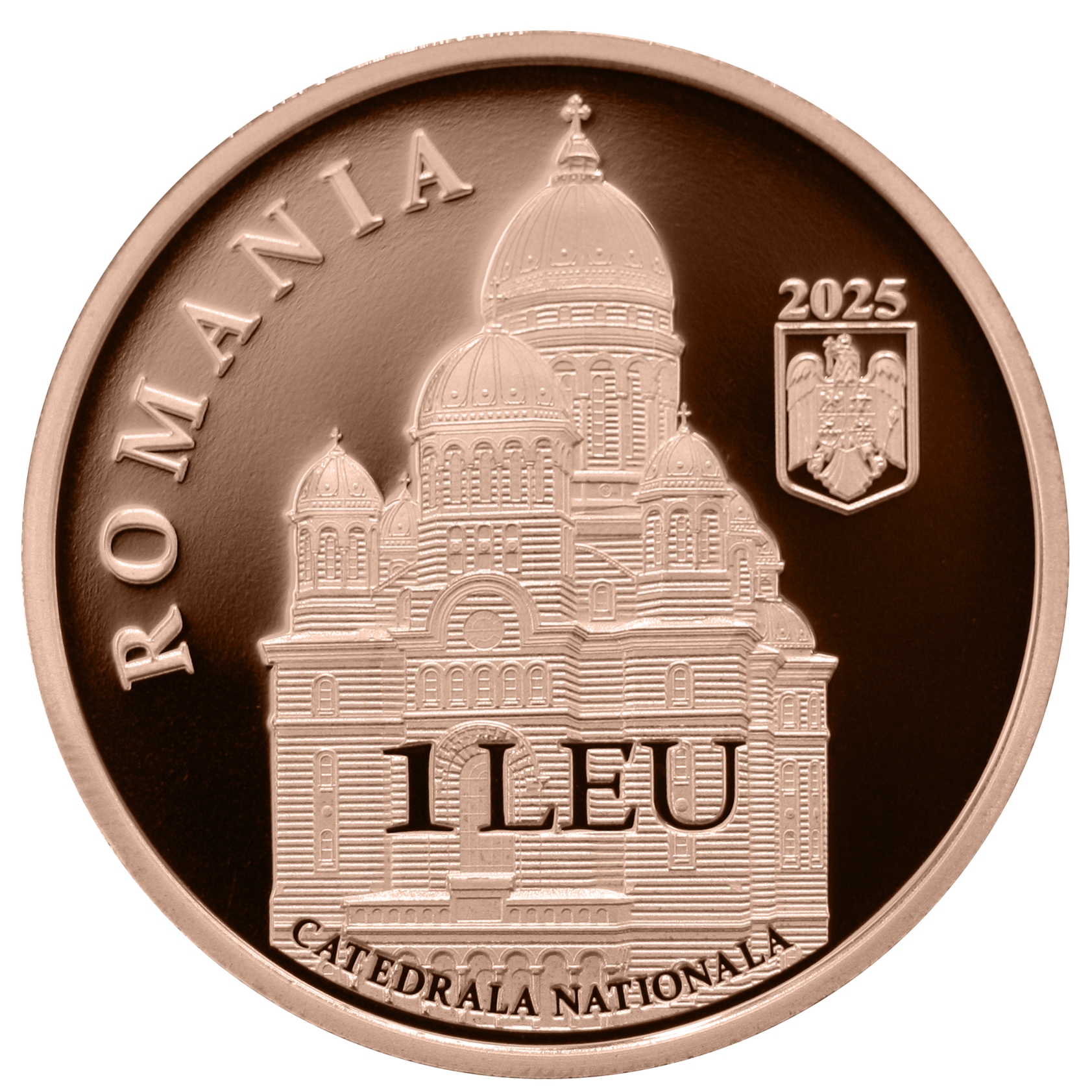 Aversul monedei din tombac cuprat prezintă macheta Catedralei Naționale, inscripțiile „ROMANIA” și „CATEDRALA NATIONALA” în arc de cerc, anul de emisiune „2025”, stema României și valoarea nominală „1 LEU”.
