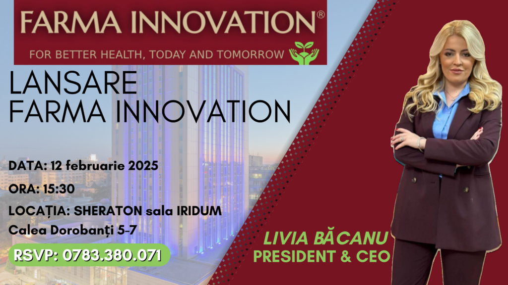 Pe data de 12 februarie, ora 15:30, va avea loc evenimentul de lansare oficială a brandului Farma Innovation la Hotel Sheraton, Calea Dorobanți 5-7, sub conducerea CEO-ului Livia Băcanu. Noua companie se poziționează ca un jucător important pe piața farmaceutică și a suplimentelor alimentare naturale din România.