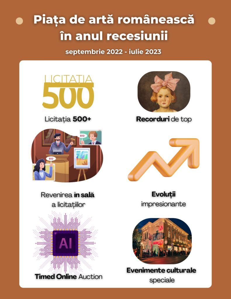 În 2023, Artmark a împlinit 15 ani de activitate, marcând totodată 500 de licitații desfășurate în piața românească de artă, în luna mai a acestei primăveri. Volumul de opere de artă și obiecte de colecție puse în vânzare prin licitațiile Casei a crescut cu 6%, ArtPrice listând Artmark drept lider al pieței de artă din sud-estul Europei, clasând A10 by Artmark pe locul 2 în Europa de Est în termeni de volume de artă puse în vânzare și vândute (după casa de licitație lider a pieței poloneze). În paralel cu creșterea numărului de tranzacții de artă în ultimul an am asistat și la o creștere a numărului de ore de licitație, cu aprox. 2% (de la 217h la 222h), ceea ce a justificat adoptarea unui nou format eficient de licitație digitală pentru unele licitații de obiecte de colecție: Timed Online Auction, bizuită pe algoritmii AI și care presupune înlocuirea comisarului fizic din sala de licitații cu unul virtual. Însă, noua tipologie de licitații a fost lansată în paralel cu revenirea la sala fizică de licitație, iar primul eveniment cu sală externă, după mai bine de 3 ani de licitații online, anume Licitația de Primăvară, s-a desfășurat recent la InterContinental Athenee Palace.