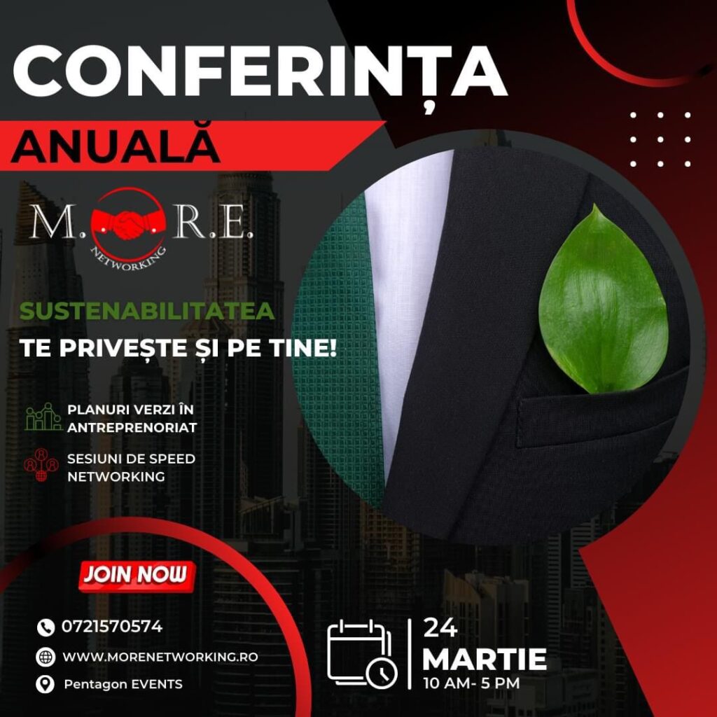 MORE Networking anunță pentru 24 martie cea de-a șaptea ediție a Conferinței Anuale de Business Networking, cel mai important eveniment de business networking al anului. Conferința va avea loc la Pentagon Events și va dezbate planurile antreprenorilor români privind viitorul verde ale mediului de afaceri.